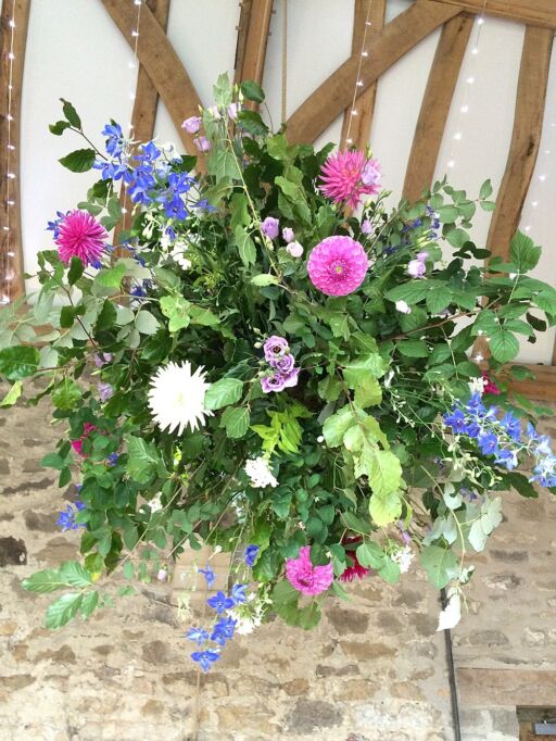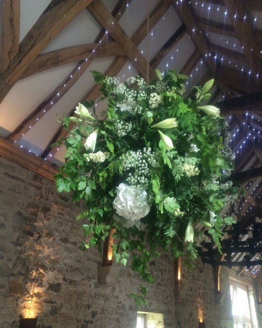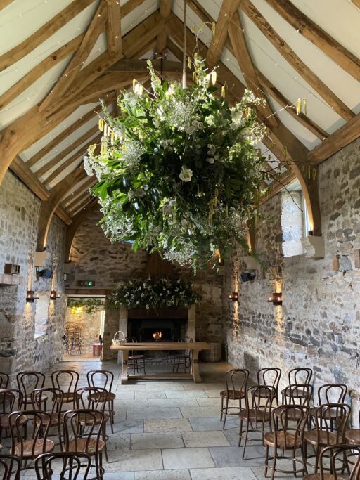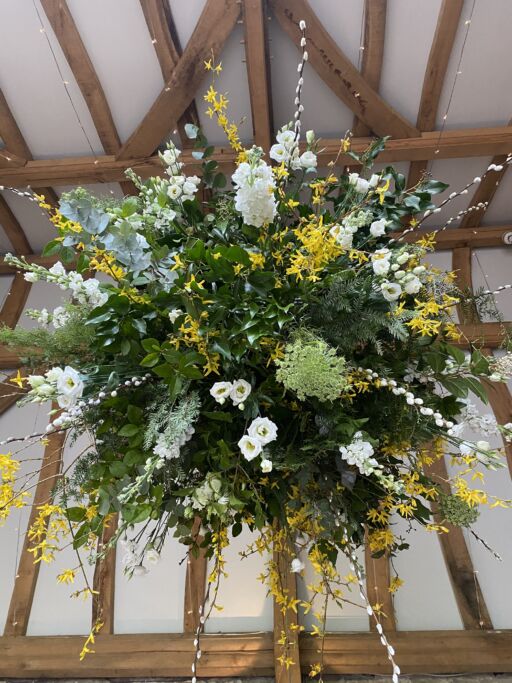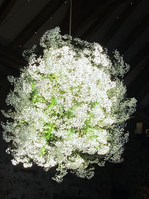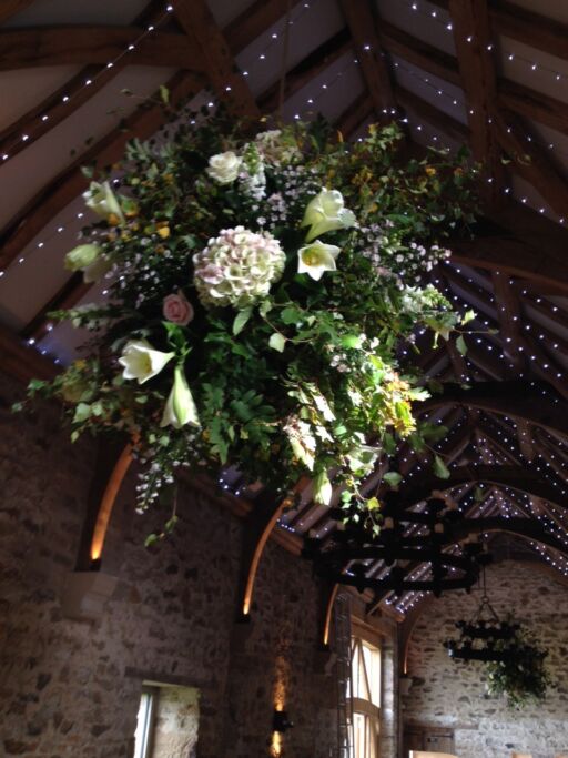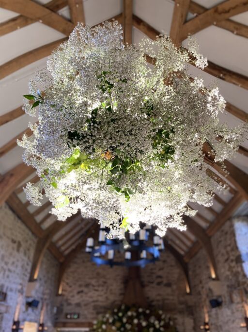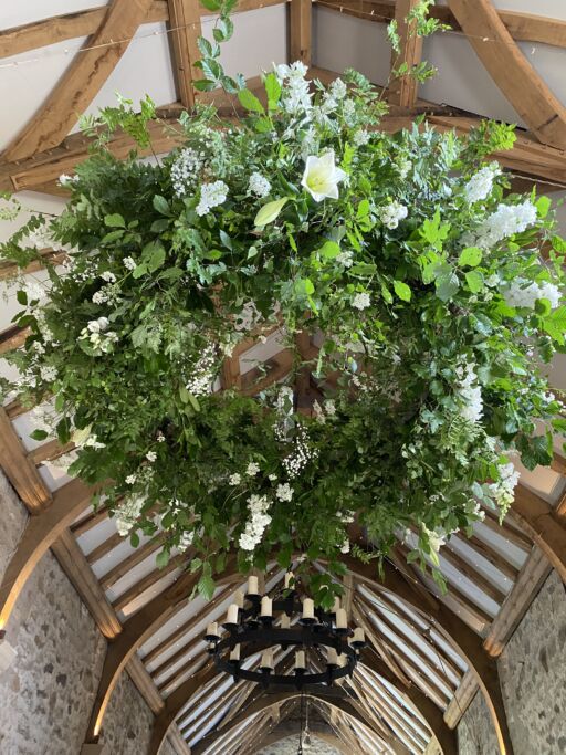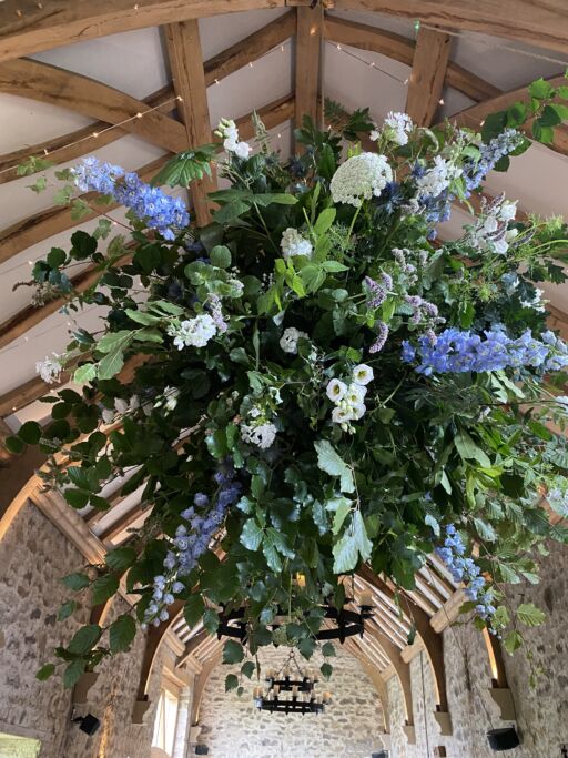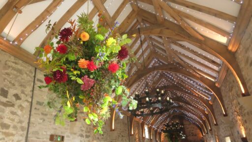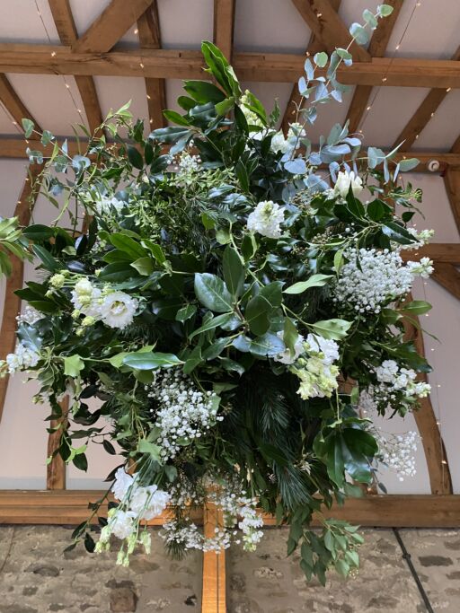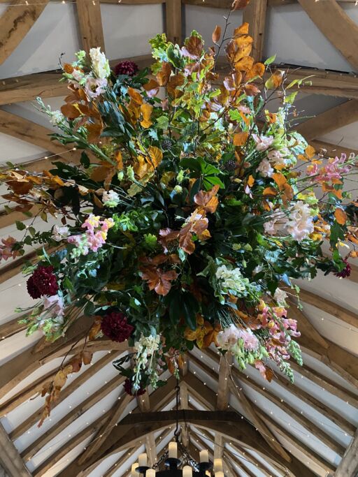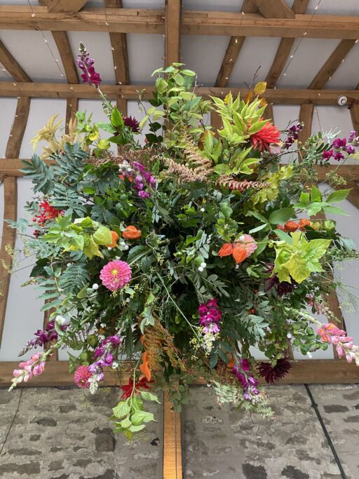 Our stunning flower bombs are spherical floral displays which hang between each of these, adding drama, colour and scent to the room.