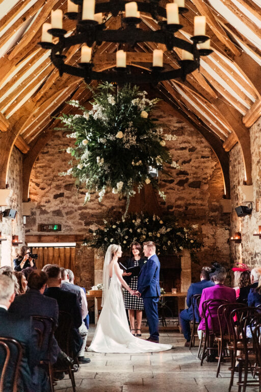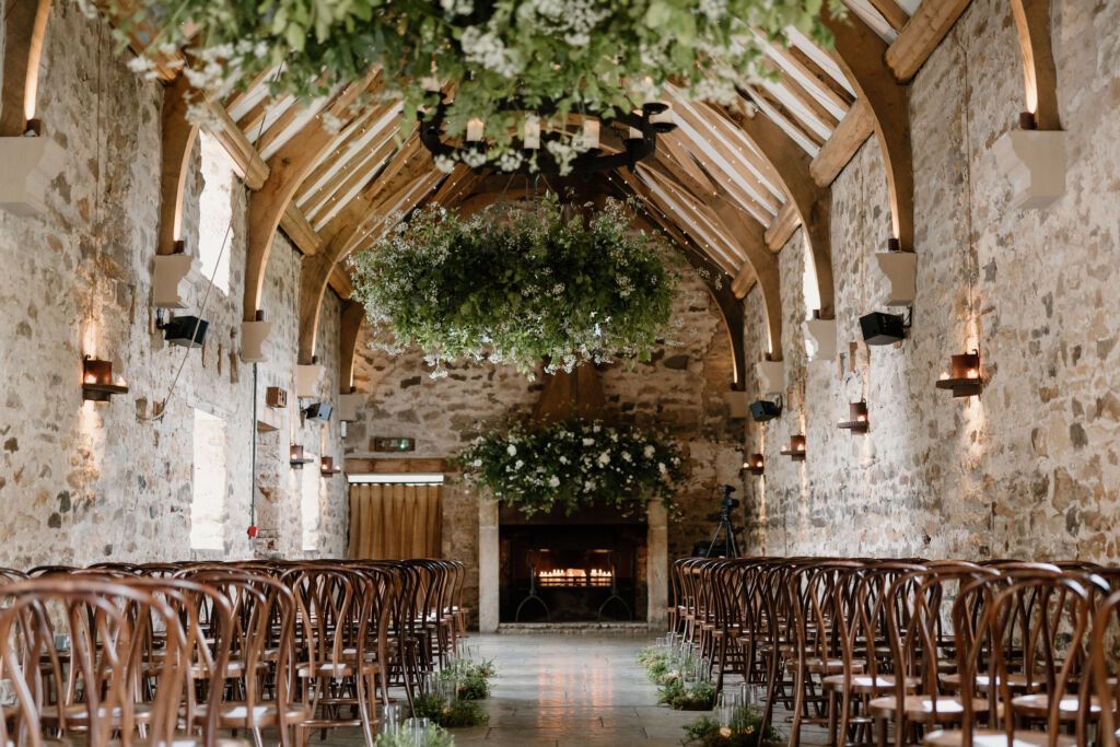 The huge oak raised cruck ceiling beams in the Long Barn carry three impressive candelabra which are focal features of the room.
